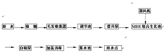 1、小區(qū)生活污水(含廚房用水等)經(jīng)過收集管路進(jìn)入污水處理站,經(jīng)隔柵過濾,去除大顆粒的泥沙、雜質(zhì)和生活垃圾后進(jìn)入沉砂調(diào)節(jié)池。進(jìn)入調(diào)節(jié)池之前,先經(jīng)過毛發(fā)收集器,去除大量的纖維狀懸浮物。調(diào)節(jié)池內(nèi)的清水進(jìn)入一體式生化池,其中缺氧生化區(qū)用于降解大分子有機(jī)物和反硝化作用,消除NH3-N。膜-生物反應(yīng)器池部分為好氧生化池。經(jīng)過生化處理和膜過濾的水,進(jìn)入加藥消毒池,加氯消毒,而后進(jìn)入集水池,再用水泵輸送到用水點(diǎn)。為了去除水中的NH3-N,好氧生化區(qū)的污泥大比例回流到缺氧生化區(qū)。