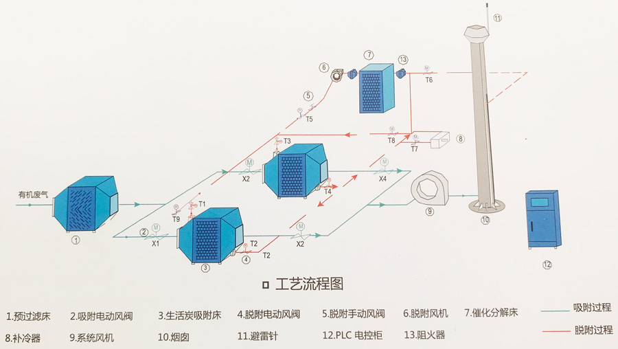 活性炭吸附飽和后,利用熱空氣講活性炭內(nèi)的有機物脫附出來,通過控制脫附過程流量可將有機物廢氣濃度濃縮10-20倍,脫附氣流經(jīng)催化床內(nèi)設(shè)的電加熱器加熱至需要的溫度,在催化劑作用下有機廢氣開始分解,催化分解過程凈化效率可達97%以上,分解后生成二氧化碳和水并釋放出大量的熱量,該熱量通過催化分解床內(nèi)的熱交換器回收,一部分用來加熱脫附出的高濃度廢氣,另外一部分加熱室外來的空氣做活性炭脫附其他使用,再生處理系統(tǒng)靠廢氣中分解的有機廢氣做能源,在無須外加能源基礎(chǔ)上使再生過程達到平衡循環(huán),極大的減少能耗,并且無二次污染的產(chǎn)生,整套吸附和催化分解過程由PLC實現(xiàn)自動控制。