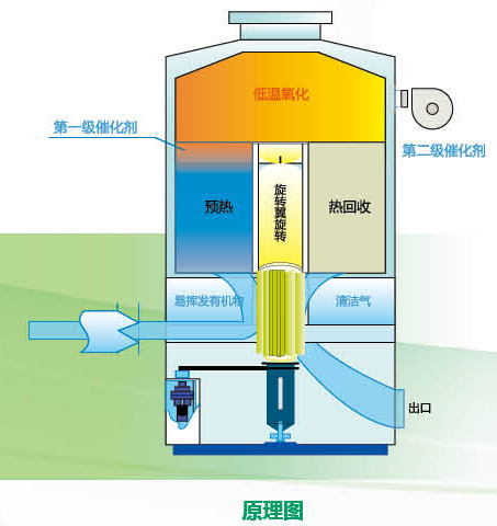 在生產(chǎn)過(guò)程中,排放的有機(jī)廢氣通過(guò)引風(fēng)機(jī)進(jìn)入設(shè)備的旋轉(zhuǎn)閥,通過(guò)旋轉(zhuǎn)閥講進(jìn)口氣體和出口氣體完全分開(kāi)。氣體首先通過(guò)蓄熱體填充層(底層)預(yù)熱后發(fā)生熱量的交換,其溫度達(dá)到催化氧化所設(shè)定的溫度,這時(shí)其中部分污染物氧化分解;廢氣繼續(xù)通過(guò)加熱區(qū)升溫,并維持在設(shè)定溫度;再進(jìn)入催化層完成催化氧化反應(yīng),即徹底反應(yīng)生成C02和H2O,并釋放大量的熱量,達(dá)到廢氣凈化的效果。經(jīng)氧化后的氣體再進(jìn)入低溫的蓄熱體填充層,將熱能傳遞給蓄熱體后通過(guò)旋轉(zhuǎn)閥排放到大氣中,排氣溫度略高于廢氣處理前的溫度。系統(tǒng)聯(lián)系運(yùn)轉(zhuǎn),自動(dòng)切換。通過(guò)旋轉(zhuǎn)閥工作,所有的蓄熱體填充層均完成放熱,吸熱的循環(huán)步驟,熱量得以回收。