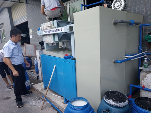 4、板框壓濾機——利用隔膜泵將反應(yīng)后混合水泵入壓濾機進行過濾脫水,壓濾后的清水進入中間水池,形成的少量固體濾餅則委外拉走;